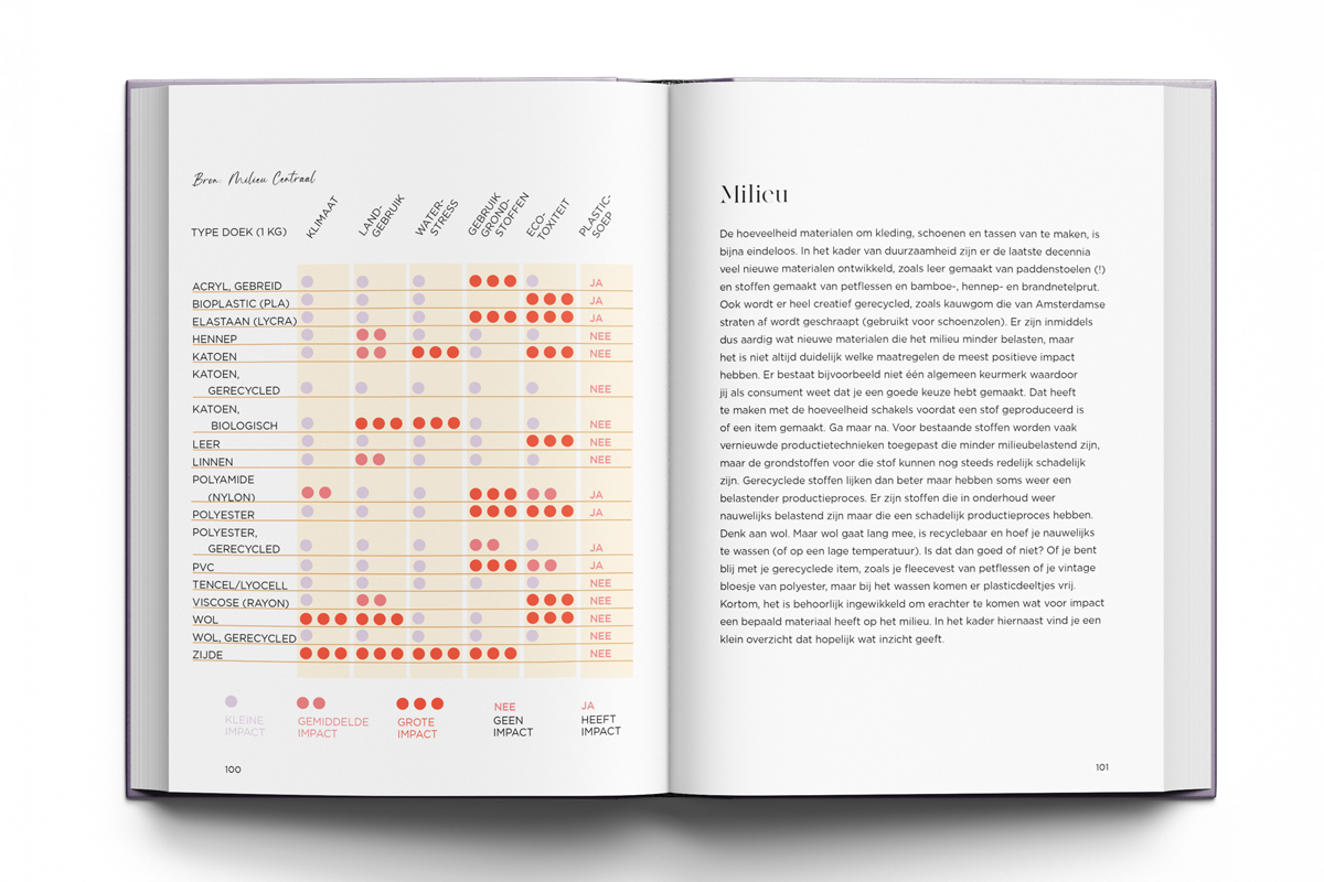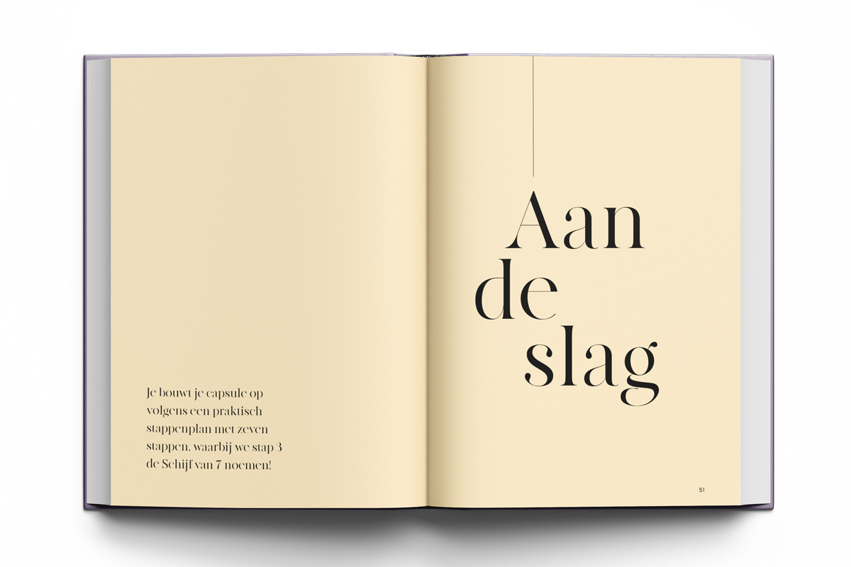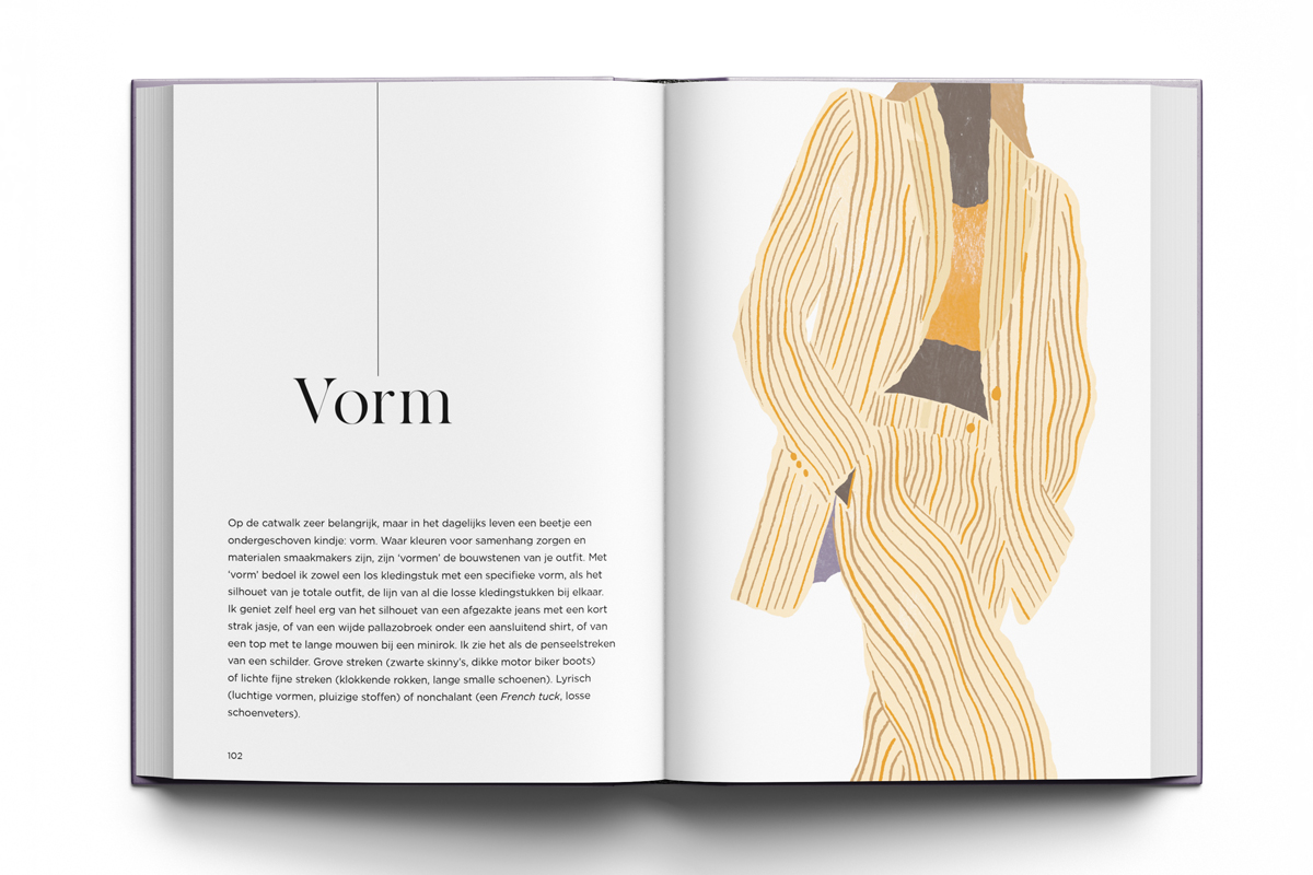 Een elegant typografisch omslag met een beeldend binnenwerk. Het boek is verdeeld in 3 delen: minder, beter en goed. De hoofdstukken worden rustig vormgegeven met uitgesproken titels. Deze worden afgewisseld met korte kaderteksten in bijzondere kleurcombinaties. Waar nodig zijn onderwerpen geillustreerd. De methode in 7 stappen. Kleur en vorm met mooi sfeerbeeld en concrete illustraties over halslijnen of waslabels.