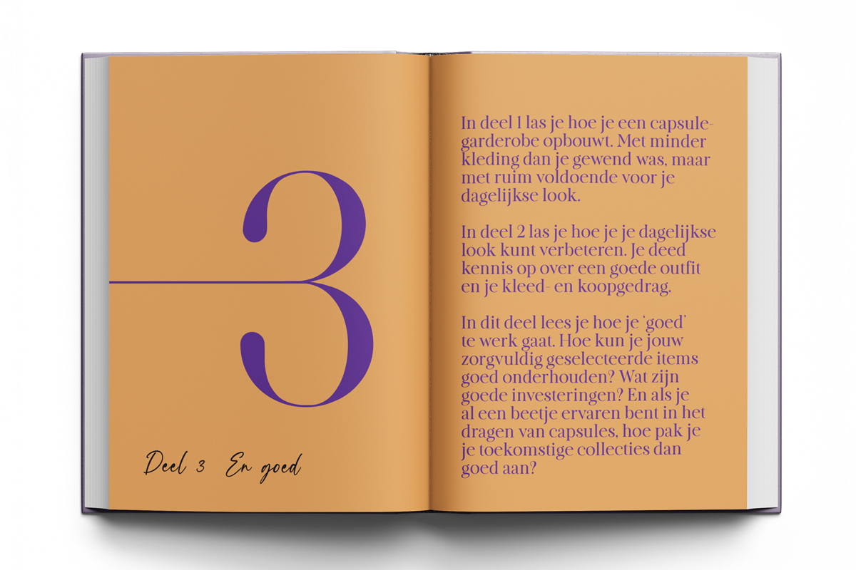 Styliste Leoni Huisman heeft een methode ontwikkelt voor een capsulegarderobe in je eigen kledingkast. In dit boek wordt stap voor stap uitgelegd hoe je dat aanpakt en daarnaast geeft zij allerlei tips en deelt zij wetenswaardigheden over kleding, bewuste keuzes, stoffen, materialen en onderhoud. Aan Ingrid de vraag een helder vormgegeven en geïllustreerd boek te maken.