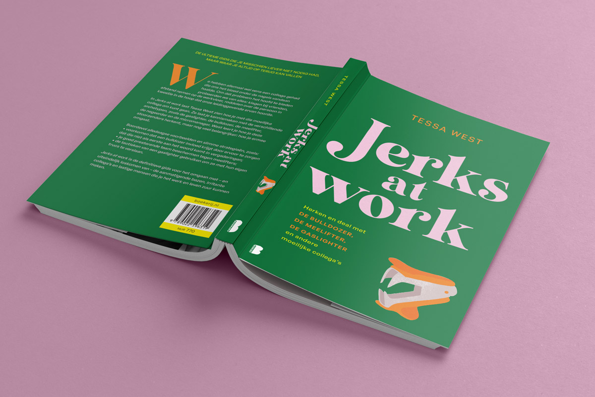 Jerks at work is een vertaalde titel, in Nederland is gekozen voor een bold typografisch omslag, aangevuld met een kleine illustratie in lekkere kleuren.