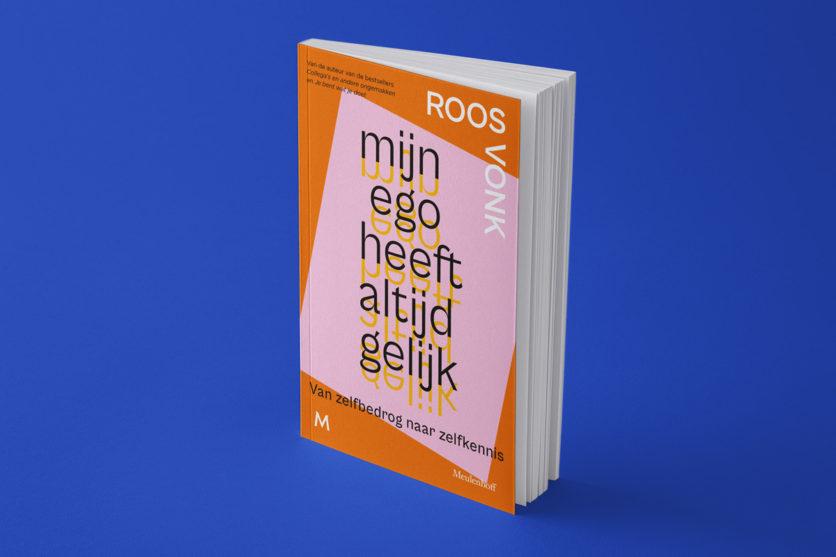 Sociaal psycholoog Roos Vonk doet onderzoek naar zelfkennis en zelfbedrog. Ze schrijft toegankelijk over het ego en hoe we ons zelf onbewust proberen te verheffen boven een ander. Het omslag mocht een twist hebben of ons een spiegel voorhouden. Het catchy roze vlak tegen het oranjerood is licht gekanteld en de titel is gespiegeld herhaald. Kleine ingrepen voor een lekker grafisch ontwerp. Het boek is verschenen met roze flappen en knalgeel tegen gedrukt.