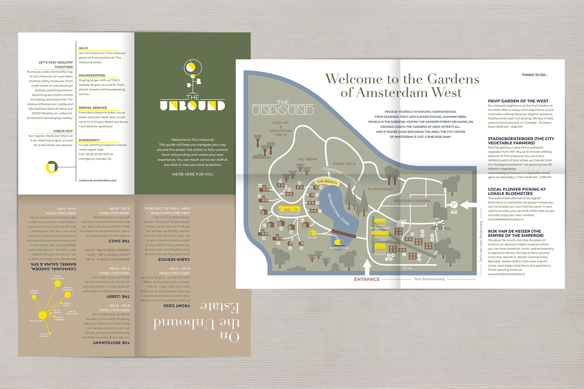 Van logo tot ikonen, van plattegronden en illustraties: de hele identiteit is vanaf de basis opgebouwd en meegenomen tot in de inrichting van de cabins. Speciaal voor The Unbound hebben we tapijten, dekens, theedoeken en servies ontworpen. Allemaal geproduceerd in Nederland door ambachtelijke bedrijven. Zelfs de kunst is gecureerd en gemaakt door Leendert meets Ingrid. Allemaal binnen de huisstijl en het opvallende kleurpalet. Van dit allesomvattende project is een magazine gemaakt, dat we graag aan je laten zien!